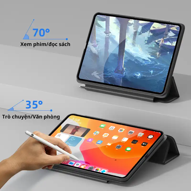 - Chế độ xem phim: Bao da biến thành giá đỡ tiện lợi, cho bạn thoải mái tận hưởng những bộ phim yêu thích.