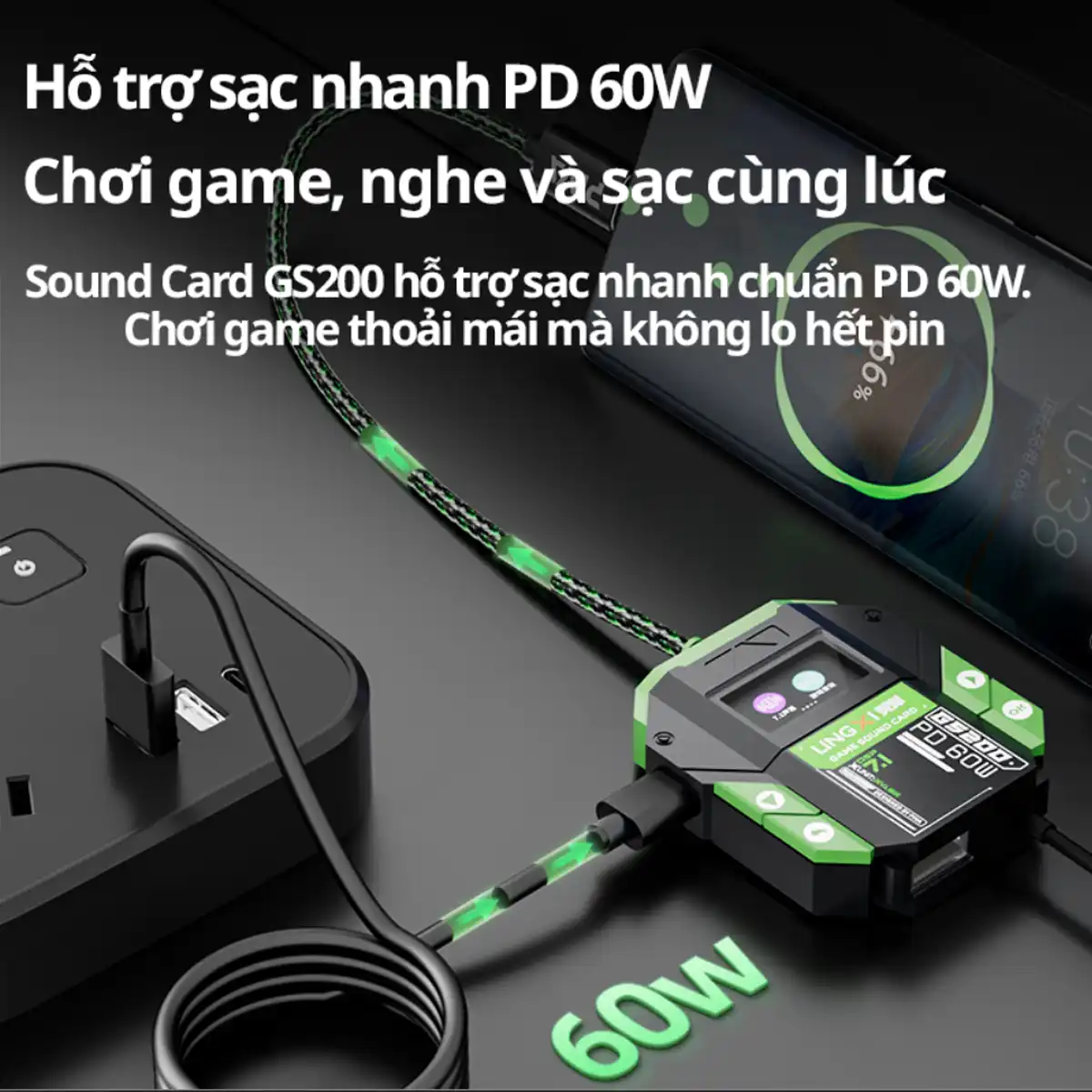Không còn lo lắng về việc sạc pin khi chơi game, Sound Card Piva GS200 hỗ trợ sạc nhanh với chuẩnPD 60W. Dù là những trận chiến kéo dài cả ngày, bạn vẫn luôn trong trạng thái sẵn sàng chiến đấu mà không phải lo hết pin.