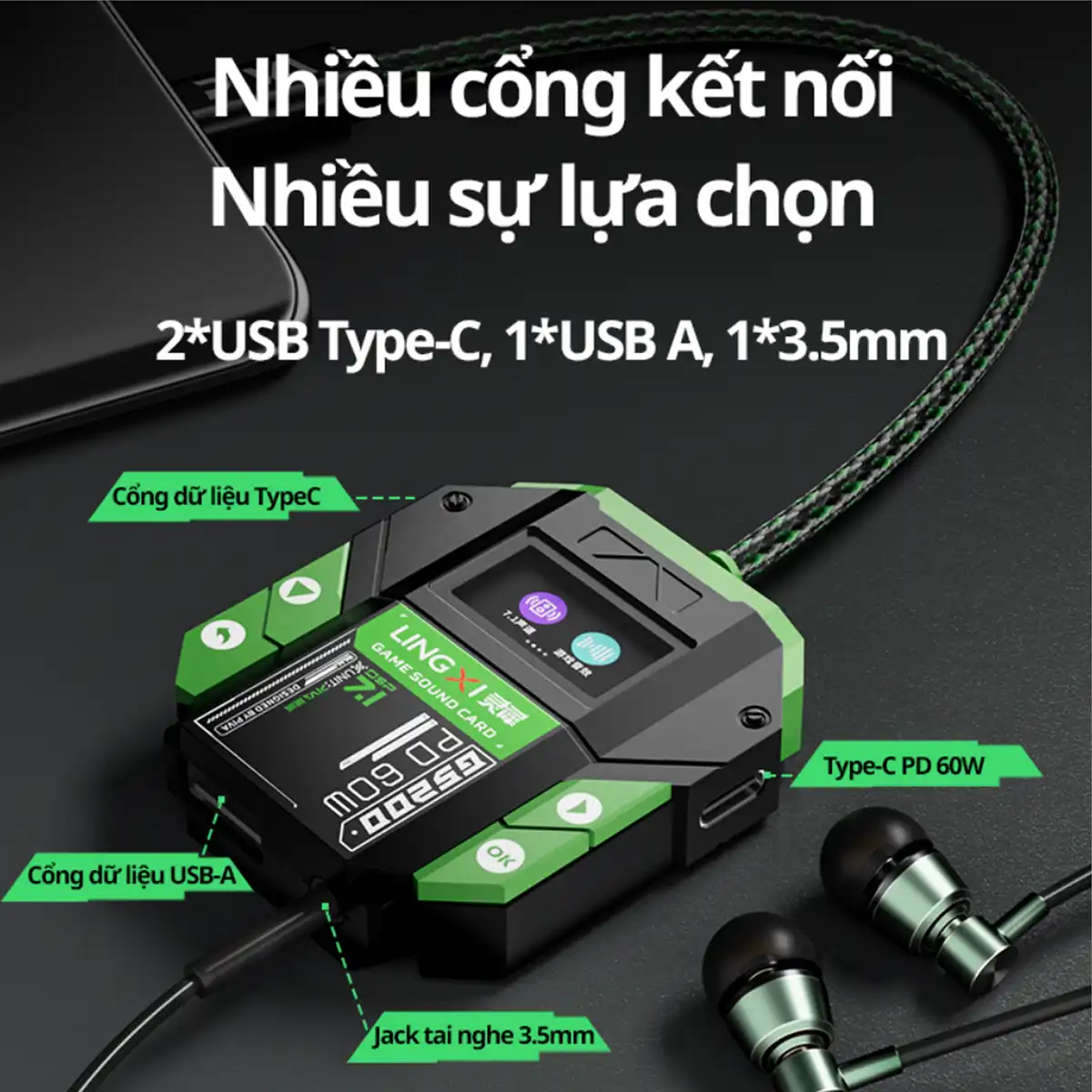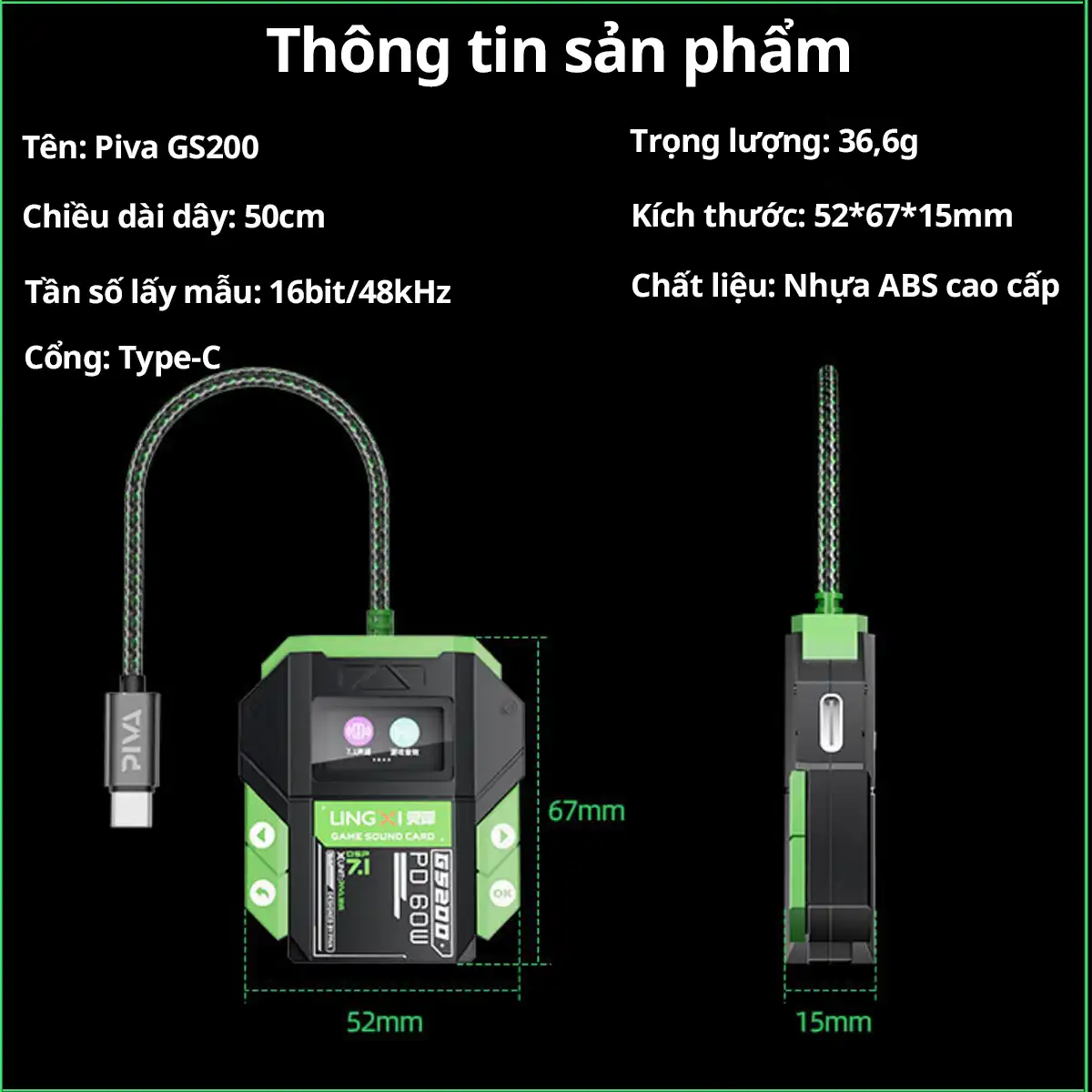 Piva GS200 Sound Card Gaming TypeC có màn hình hiển thị tăng tiếng chân PUBG sạc PD 60W âm thanh vòm 7.1 Mic đàm thoại